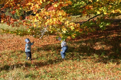 Janina und Jonathan beim Baumschütteln